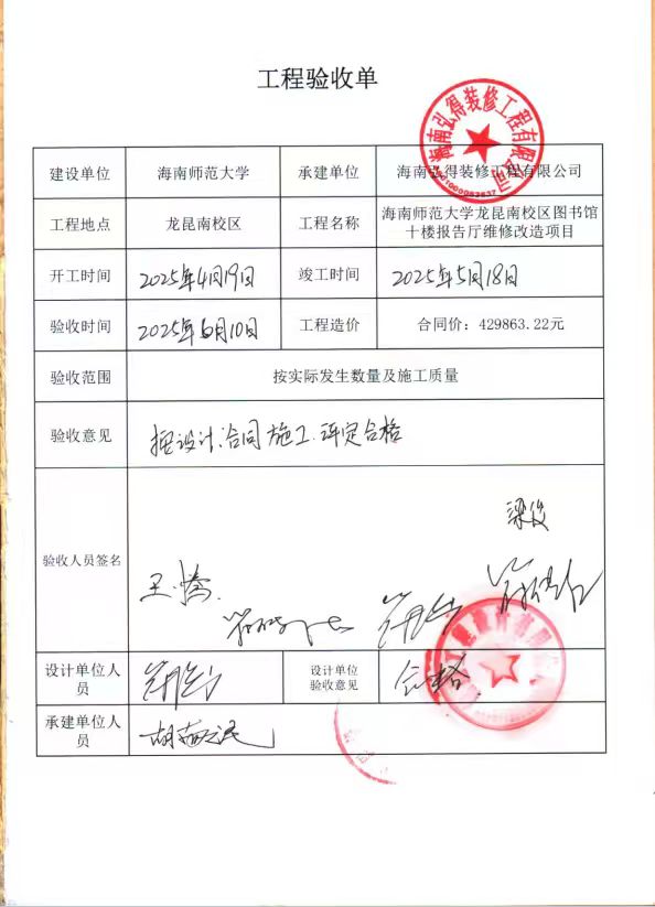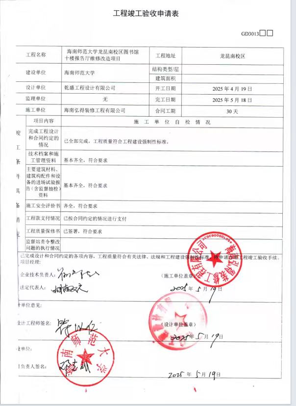 海南师范大学龙昆南校区图书馆十楼报告厅维修改造项目验收材料: